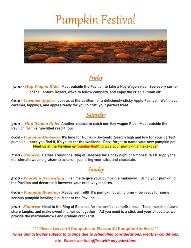Each night our Entertainers will have a boatload of fun planned for children of all ages. Our activities are seasonal and follow the campground schedule seven days a week during the summer (Father’s Day weekend thru the 3rd week of August). Spring and Fall weekends feature Friday and Saturday night entertainment ending with our 3 day Pumpkin Festival on Columbus Day Weekend.